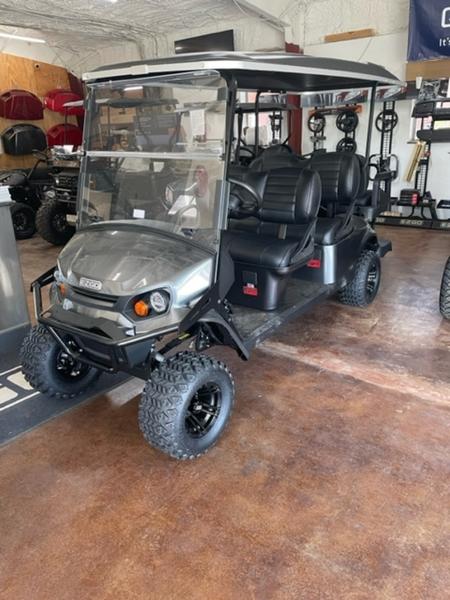 Brand new 2023 gas-powered 6-passenger golf cart available for $350 per weekend, plus delivery and a $25 fuel charge. This is not your average rental—it’s a brand new 2023 L6 gas model, just added to my fleet on 4/22/23 and still in my showroom, never driven. It features a factory long-top roof covering all 6 passengers, premium bolstered seats, LED lights, horn with brake lights, lighted cup holders, and a cooler in the back for your drinks, with cup holders for both front and rear passengers.